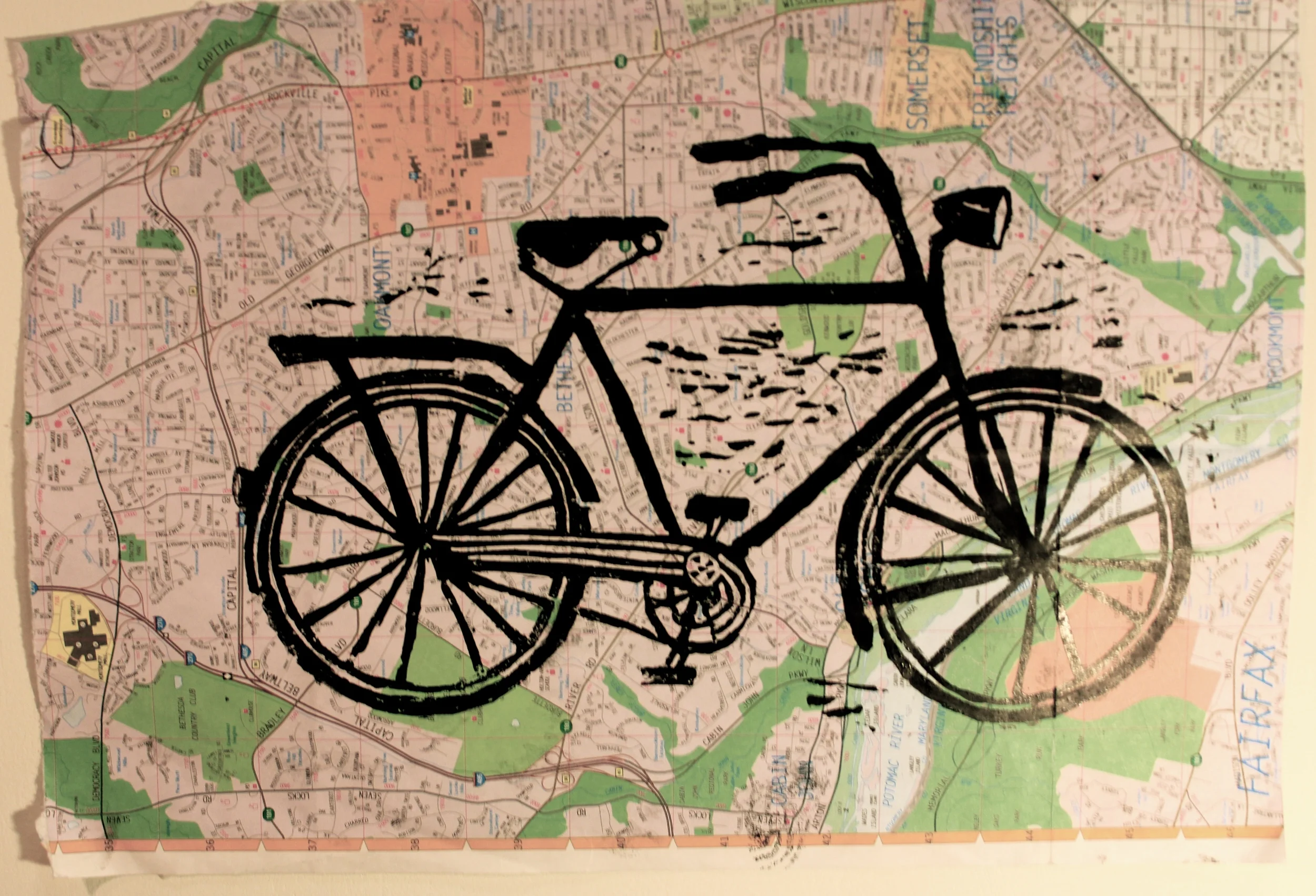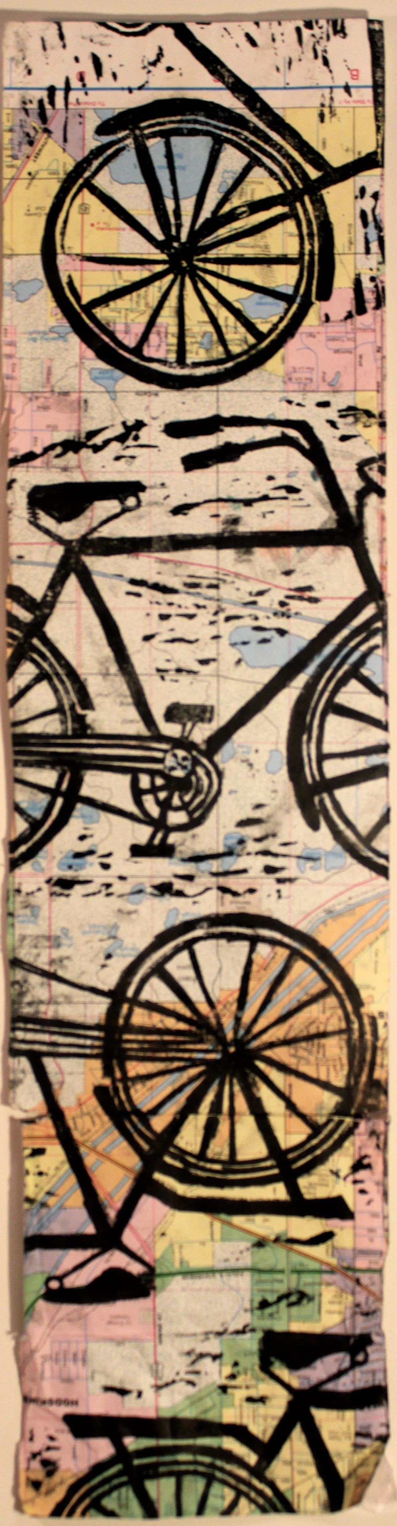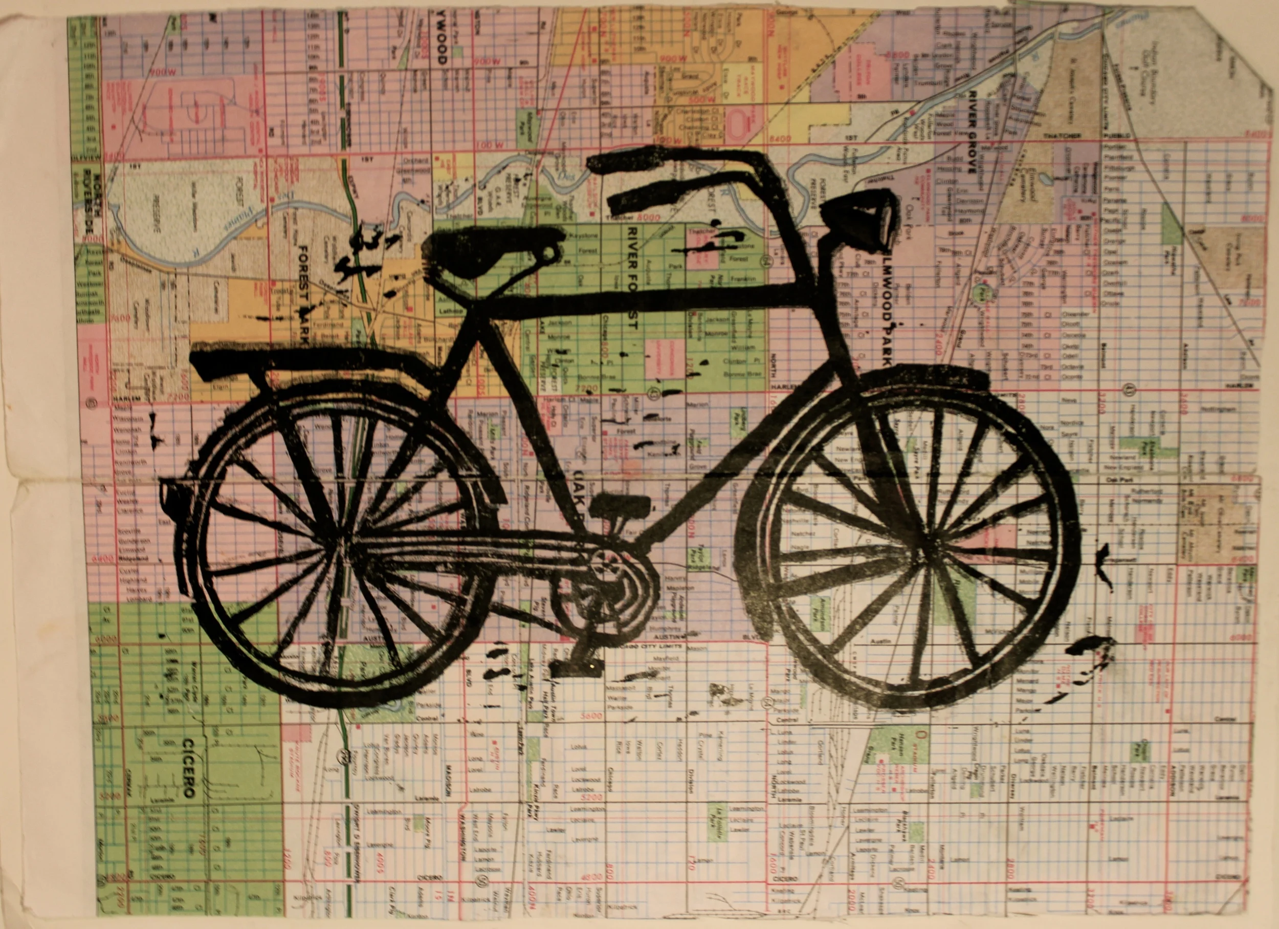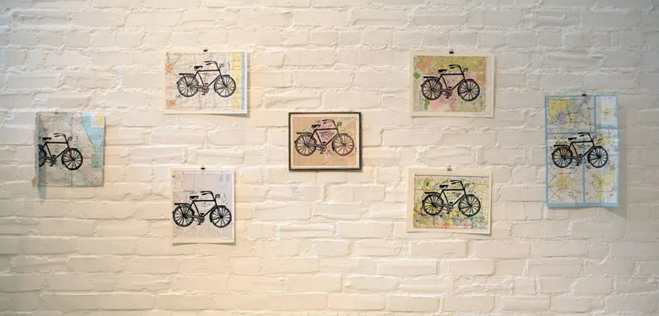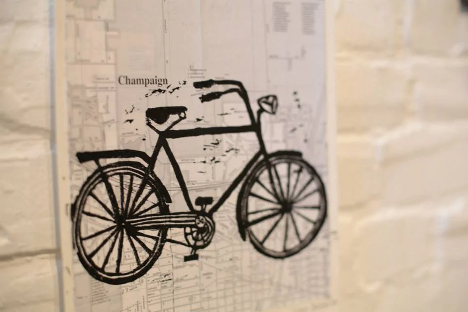 A series of bike prints I created for the Tandem Bike Arts Showcase held in August 2013 at the Indi Go Gallery in Champaign, IL. Bicycles were printed on various up cycled maps and half the profits from sales went to the Bike Project of Champaign-Urbana.